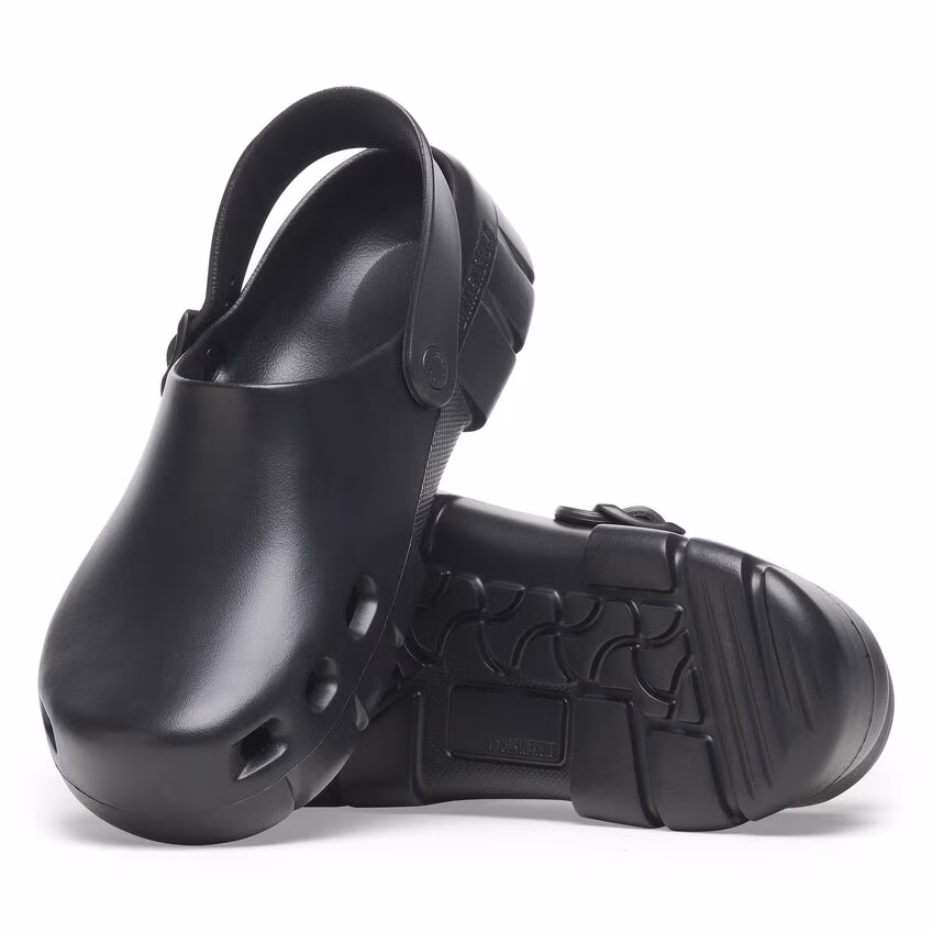 The Birkenstock Birki Flow EVA in Black is a versatile, all-weather clog designed for comfort, durability, and ease of wear. Made entirely from flexible and lightweight EVA material, this slip-resistant clog is waterproof, washable, and skin-friendly—ideal for both indoor and outdoor use. It features a contoured footbed inspired by the classic Birkenstock design, offering arch support and stability in a lightweight, one-piece construction. The closed-toe design adds extra protection, making it suitable for everything from casual wear to professional environments like kitchens and healthcare settings. With its clean black finish and easy-to-clean build, the Birki Flow EVA is a practical choice for anyone seeking all-day comfort and function.